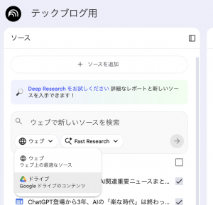 また各種Researchについてはウェブとドライブに対して可能となっており、実行すると以下の通り、データソースが追加されます。