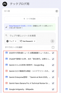 添付の通り11月のGoogle関連アップデートについてWeb検索をしてデータソースを追加しております。その上でチェックボックスにチェックを入れるかどうかによってこの後のスライド作成のデータソースにするかどうか調整することができます。