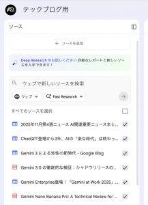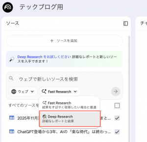 添付の通り、「Fast Research(高速)」と「Deep Research(詳細)」を使い分けることができ、今回新たにDeep Researchの機能が新たに追加されました。
