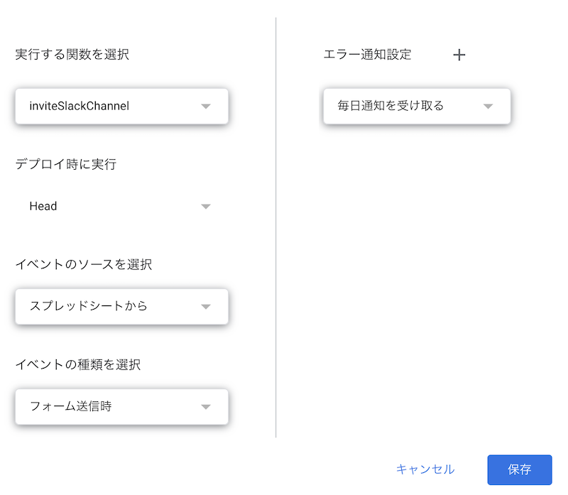 以下の画面がでてきたら実行するスクリプトに「inviteSlackChannel」を選択。